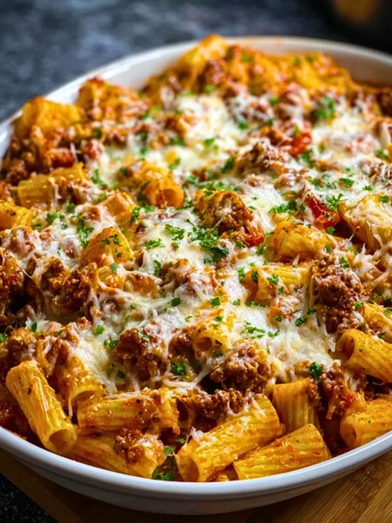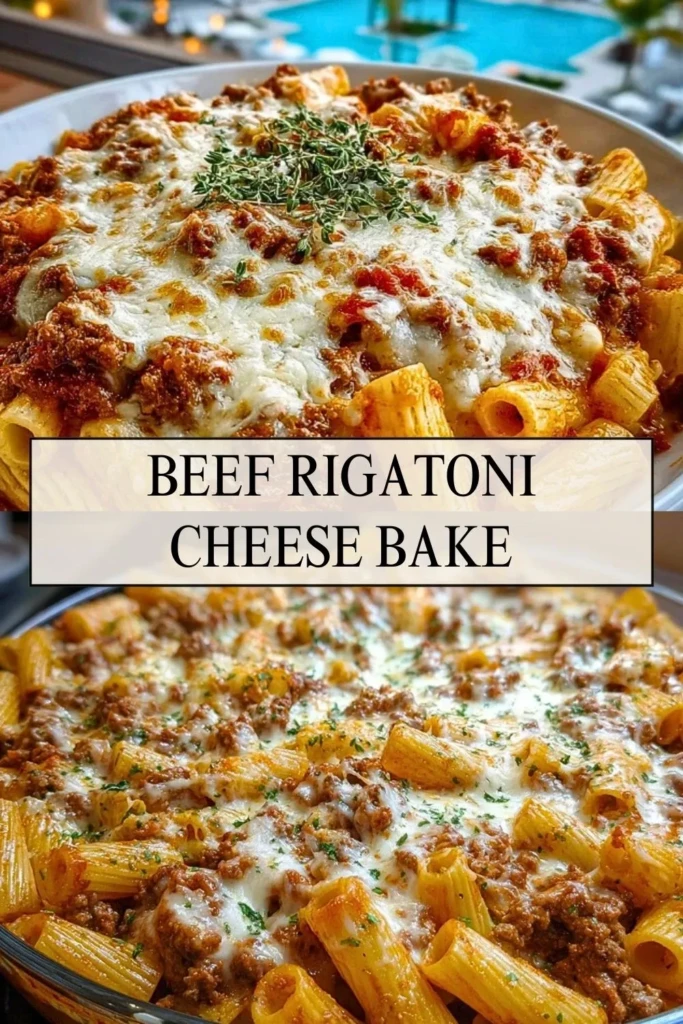 Keywords: beef pasta bake, cheesy rigatoni, easy dinner, weeknight pasta, baked rigatoni