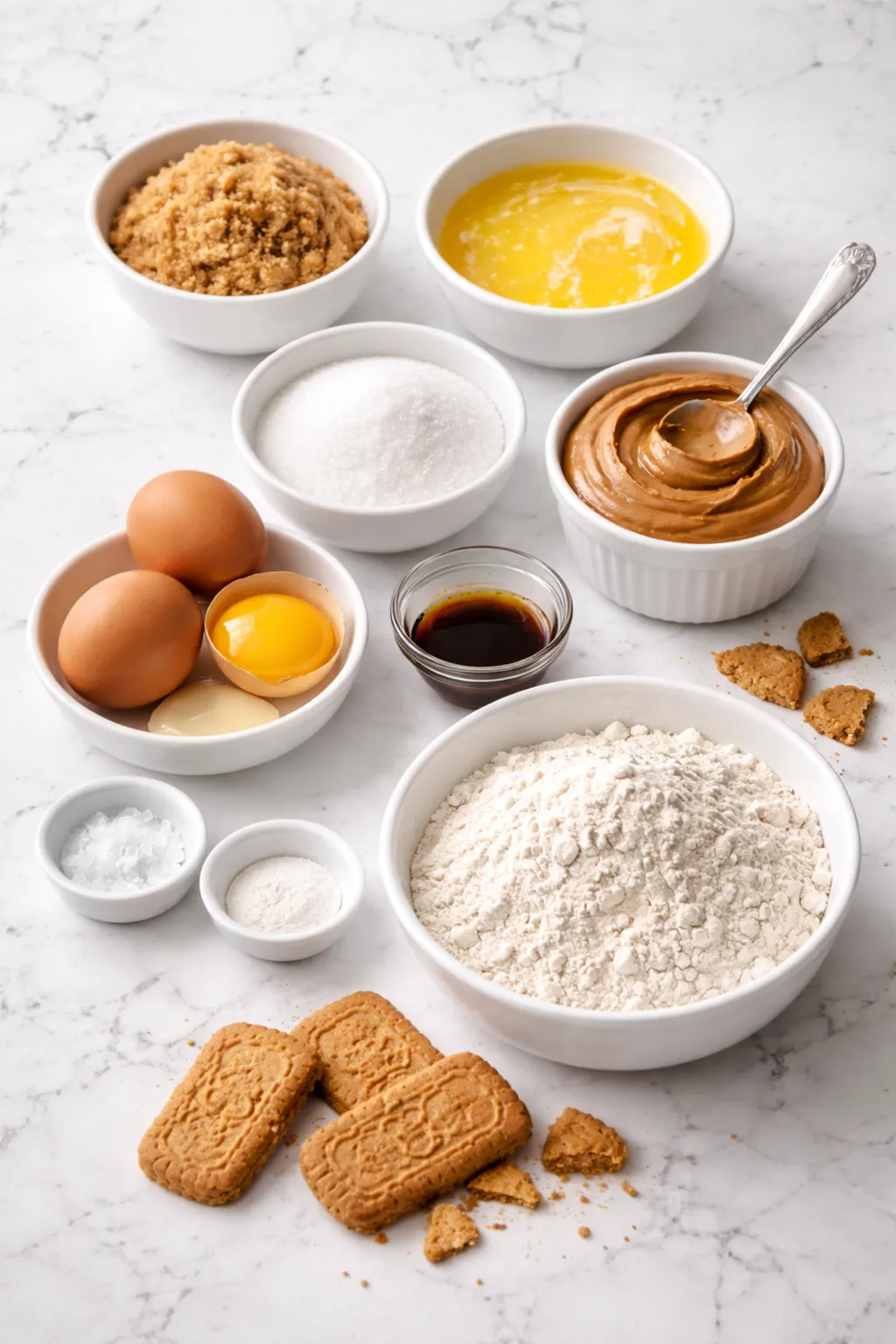 Each of these plays a specific role: the butter and brown sugar create moisture and chew, the cookie butter delivers that signature spiced caramel flavor, eggs bind everything together, and flour plus a touch of baking powder give the bars enough structure to slice cleanly without turning cakey. Crushed Biscoff cookies add texture and intensify the flavor throughout.