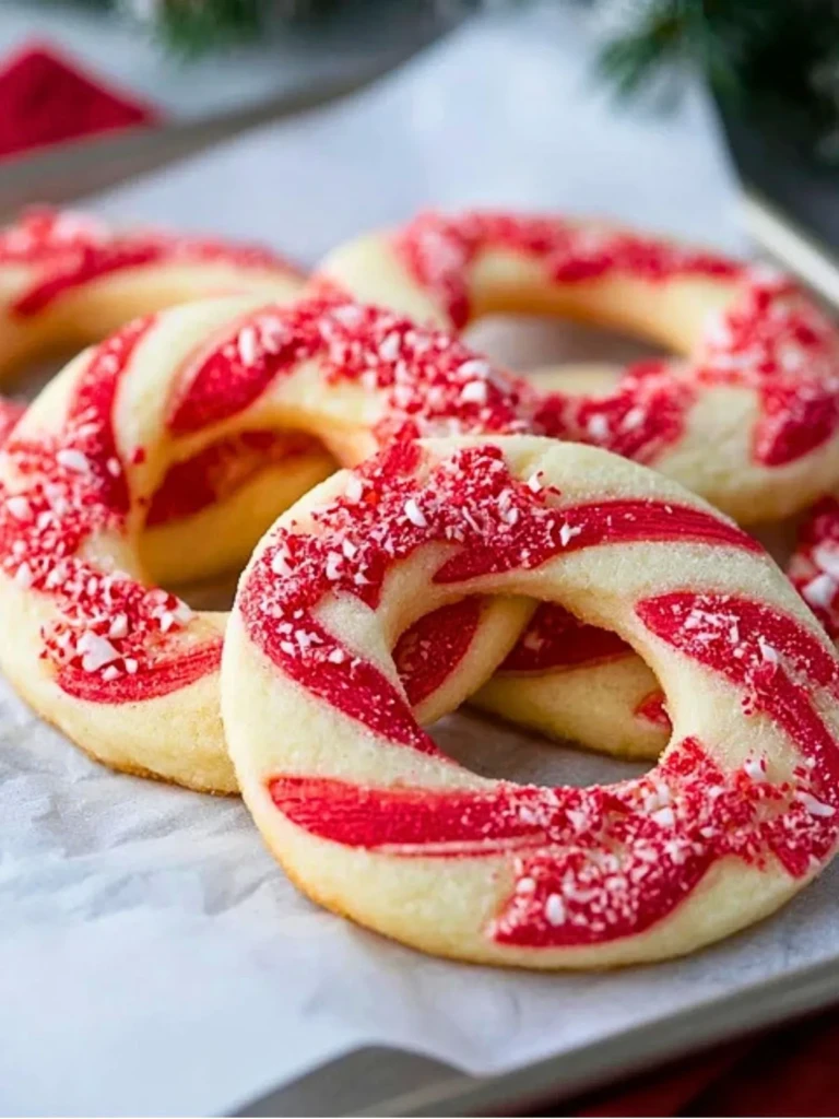 What makes these cookies stand out is the shaping method. Instead of the typical straight candy cane, I twist the dough into circular wreaths, making them easier to bake evenly and much more satisfying to bite into. The visual effect is beautiful—like peppermint swirl ornaments you can eat—and the sugar dusting at the end gives them a frosted, almost snow-kissed finish.