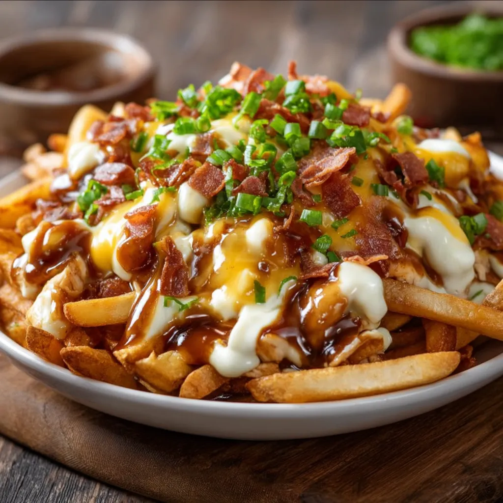 6. Assemble the dish: Layer crispy fries on a platter, top with chicken and cheese curds. Pour on hot gravy, then drizzle with cheese sauce. Finish with crumbled bacon and chopped green onions. Serve immediately.