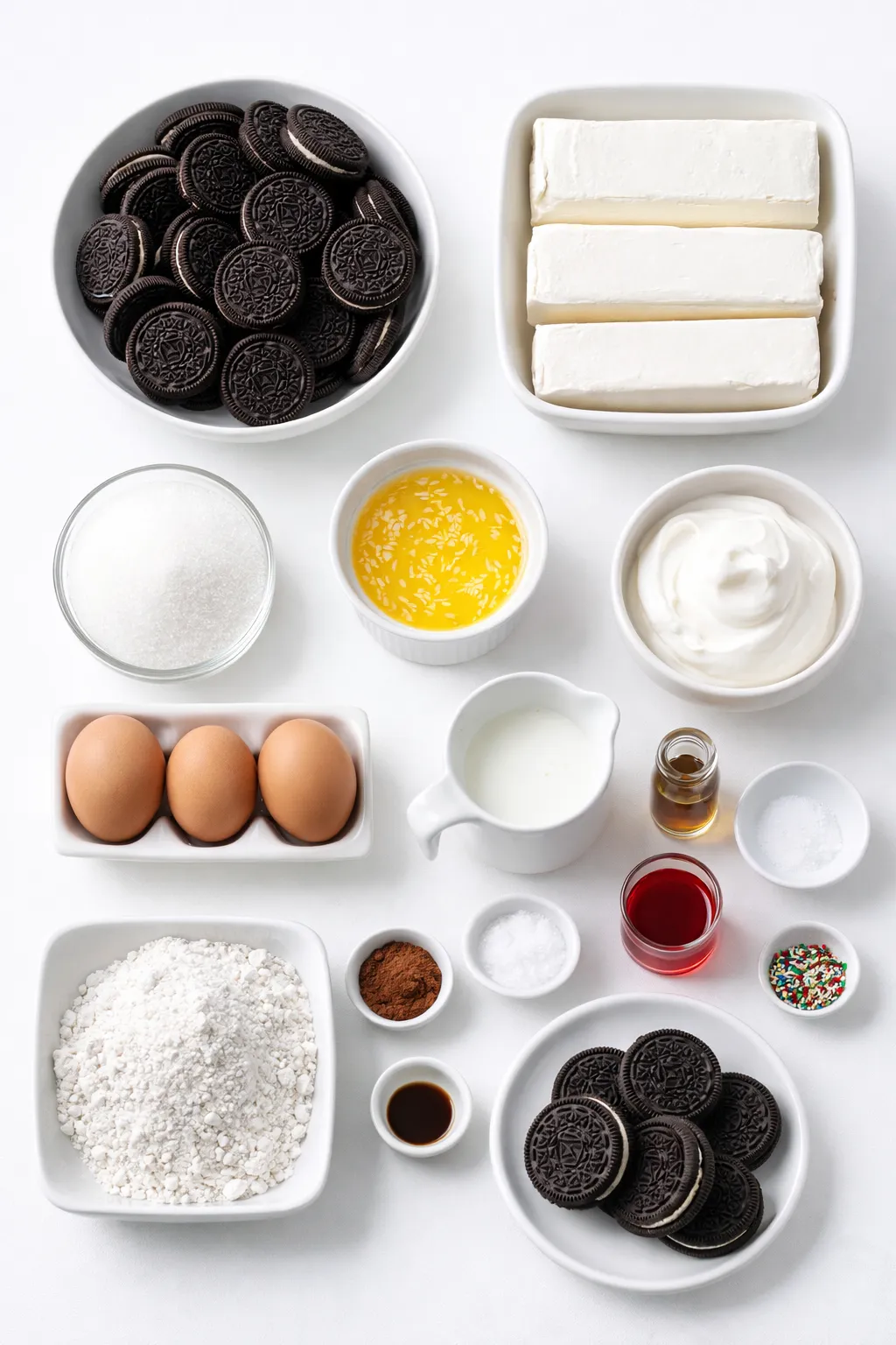 Ingredients for the Christmas Red Velvet Cheesecake with Oreo Crust