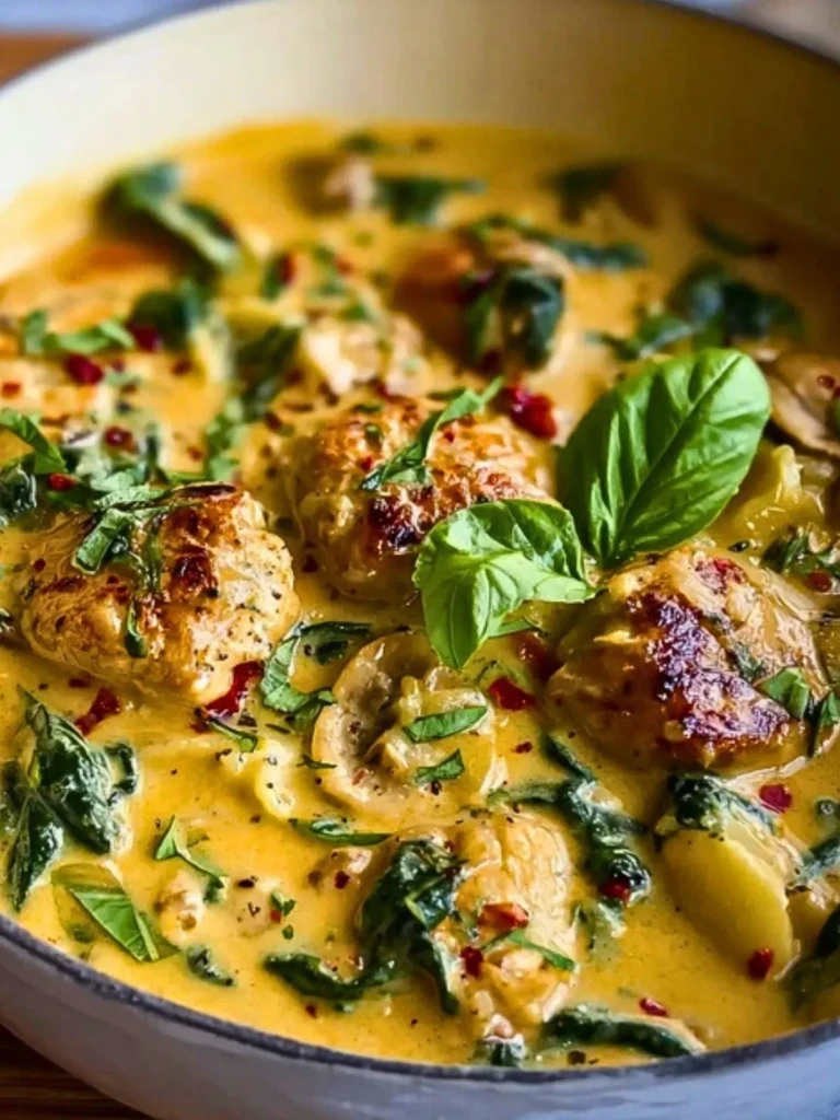 This isn’t your average chicken soup. It has the soul of a comfort dish, but the elegance of a weekend dinner. You get tender chunks of seared chicken, meaty mushrooms, and sun-dried tomatoes swimming in a creamy, dairy-free broth that doesn’t feel like a substitute—it feels like an upgrade.