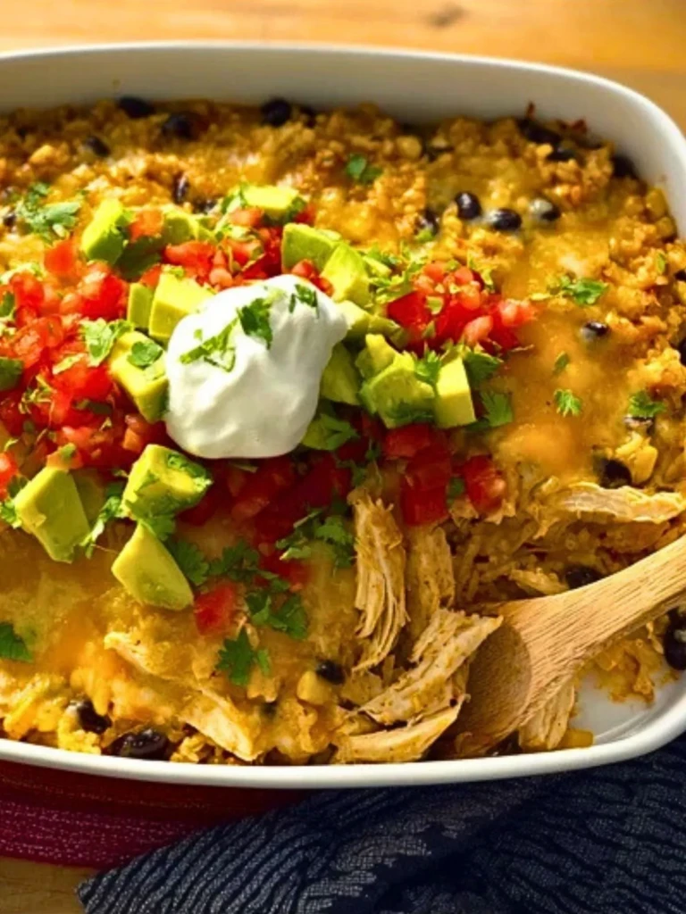 This casserole hits all the right notes—creamy, savory, just a little spicy, and loaded with that warm, homey flavor that makes second helpings feel inevitable. Each bite gives you fluffy rice soaked in seasoned tomato broth, tender shredded chicken, sweet pops of corn, and a melty blanket of cheddar cheese. Then, just when you think it can’t get better, you hit the cool sour cream, bright lime, buttery avocado, and chopped cilantro on top.
