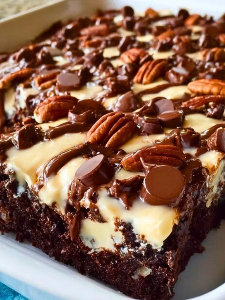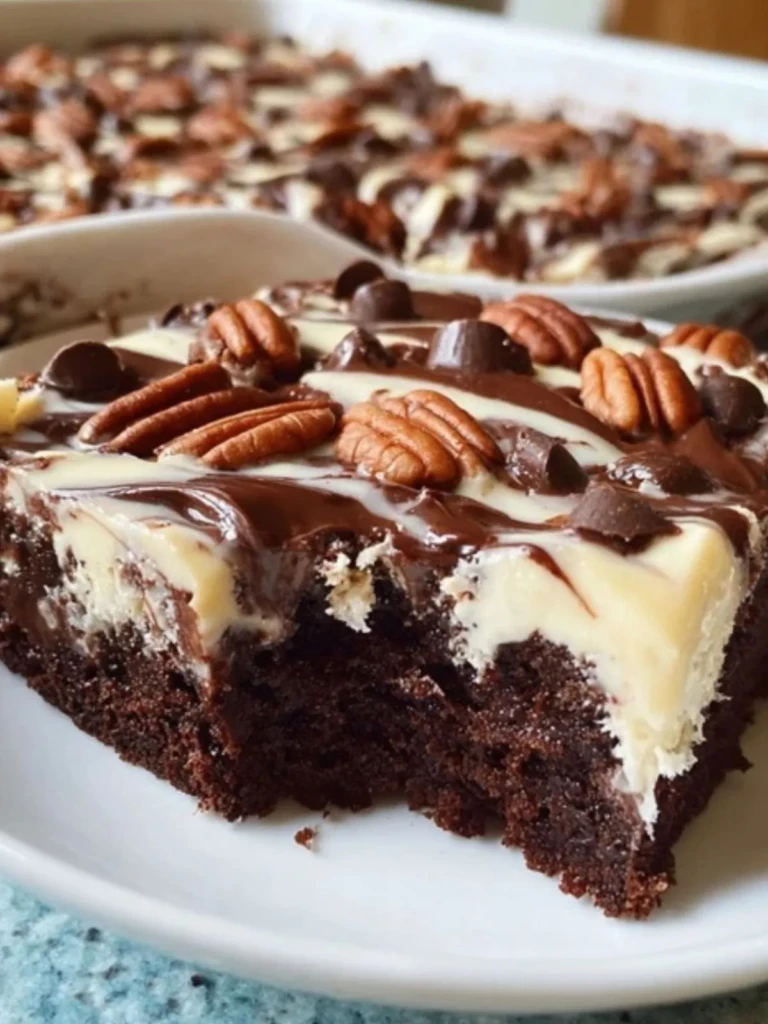The cream cheese layer stays soft even after cooling, while the chocolate chips give just enough firmness to contrast with the tender cake. The coconut crisps around the edges, and the pecans add that lovely crunch. It’s a cake you eat slowly, forkful by forkful, savoring how every bite feels just a little different.