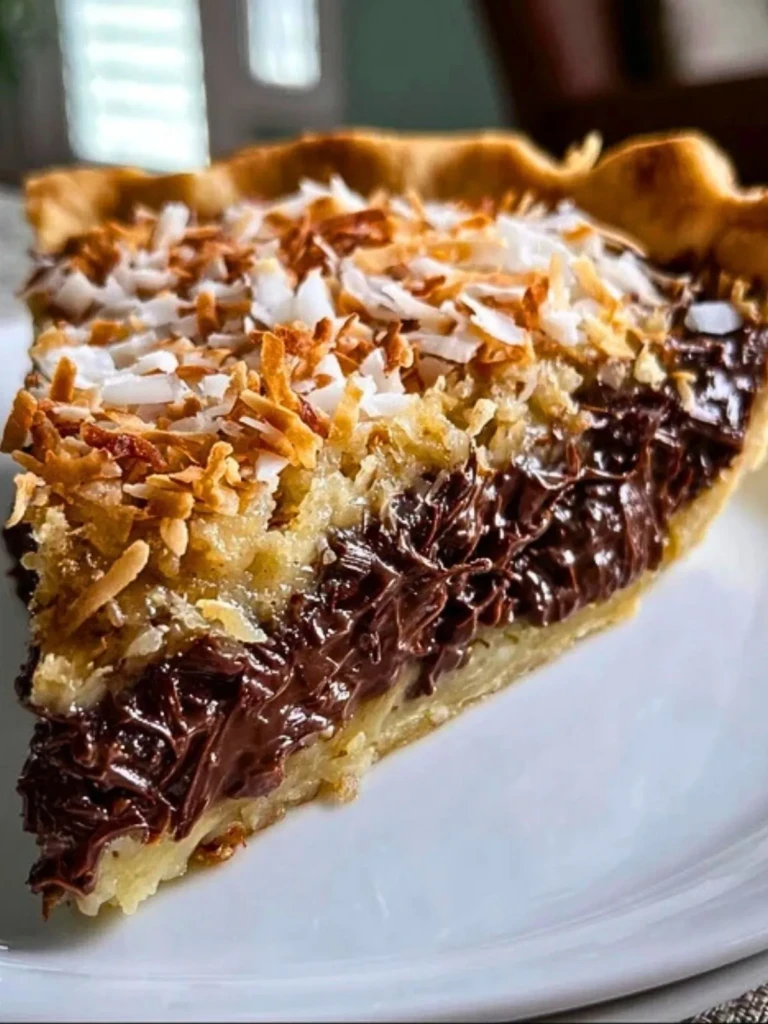 This pie brings together the chew of toasted coconut, the silkiness of melted chocolate, and the crisp snap of a golden pie crust. It’s rich but balanced, with every bite offering a little crunch, a little melt, and a lot of satisfaction.