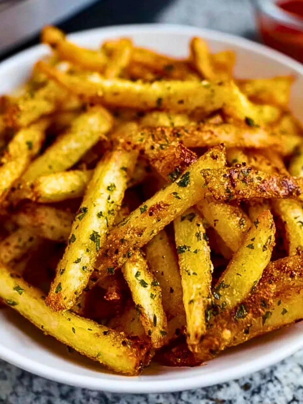 Once golden and crispy, transfer fries to a bowl and immediately sprinkle with Parmesan and parsley. Toss gently to coat. Serve hot with your favorite dipping sauce.