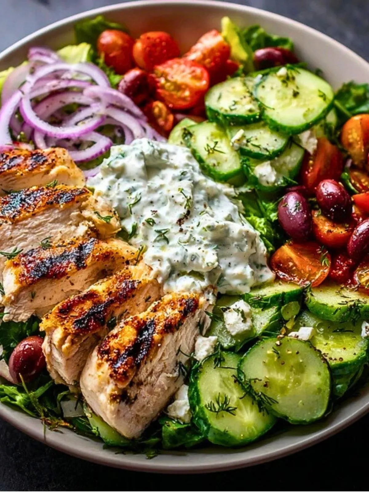 In a large bowl or platter, layer your greens, then pile on the cucumbers, tomatoes, onions, olives, and feta. Add the sliced grilled chicken and finish with a generous scoop (or three) of tzatziki right in the center.