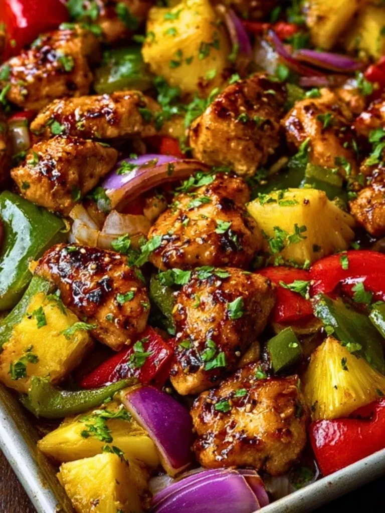 Keywords: sheet pan chicken, pineapple chicken, easy dinner, tropical chicken, roasted chicken