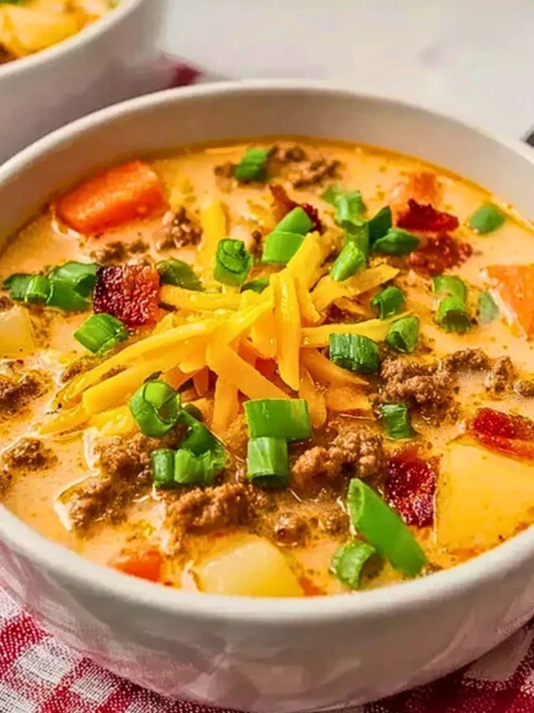 Homemade Cheeseburger Soup is a hearty, creamy soup loaded with tender potatoes, seasoned ground beef, sweet carrots, and plenty of sharp cheddar. It’s perfect for chilly nights or cozy weekends. I love making it with Yukon Gold potatoes, whole milk, and freshly grated cheddar for a smoother, more comforting texture. This is a simple, family-friendly soup that feels like comfort in a bowl. Some call it Cheeseburger Chowder or Bacon Cheeseburger Soup, especially when made with stabilized dairy for slow cookers. I’ve tested it with cream cheese or extra broth for variations—both work beautifully. Among soup recipes, Homemade Cheeseburger Soup stands out for its rich, creamy flavor, satisfying texture, and nostalgic appeal. It deserves a permanent spot in your cold-weather dinner lineup.