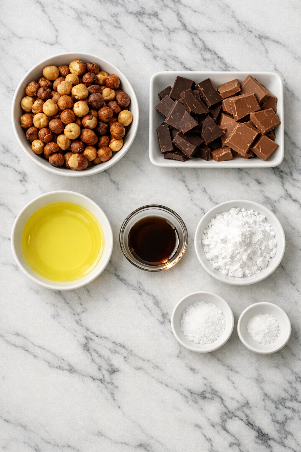 1. Roast hazelnuts at 350°F for 10–12 minutes until golden and fragrant. Let cool slightly.