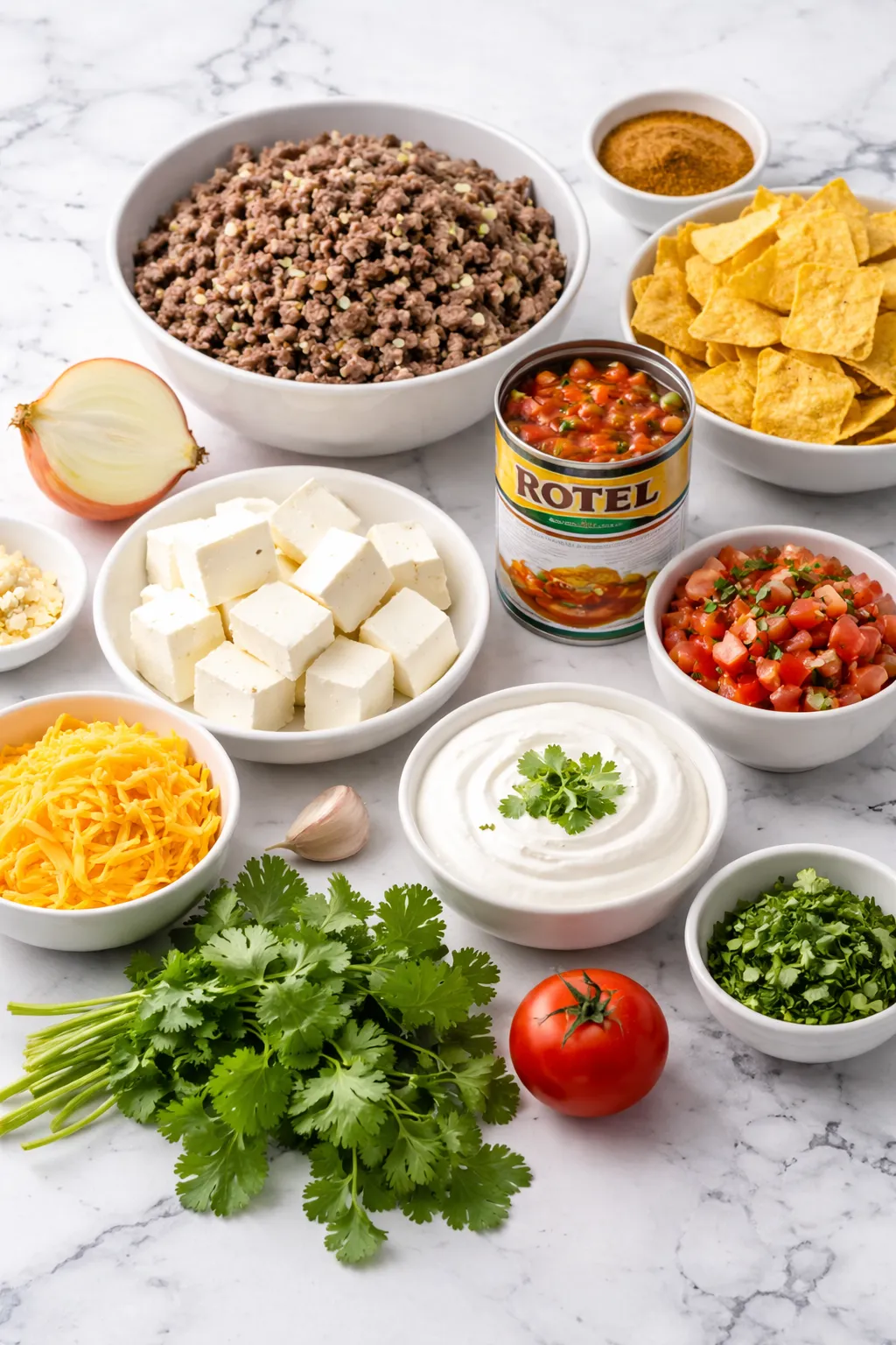 Ingredients for the Melty Rotel Dip With Ground Beef And Sour Cream
