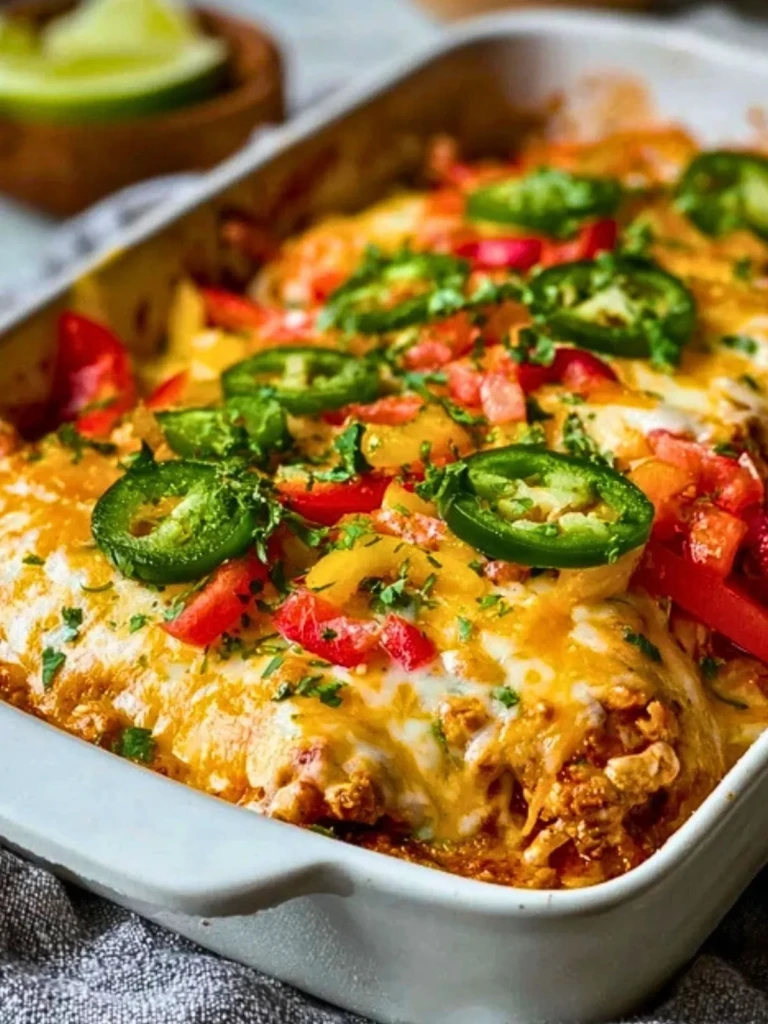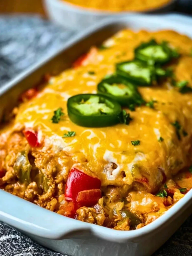 A cozy Tex-Mex casserole loaded with juicy seasoned chicken, colorful bell peppers, sweet corn, and smoky spices—all wrapped in a creamy queso base and topped with bubbling cheddar and Monterey Jack cheese.