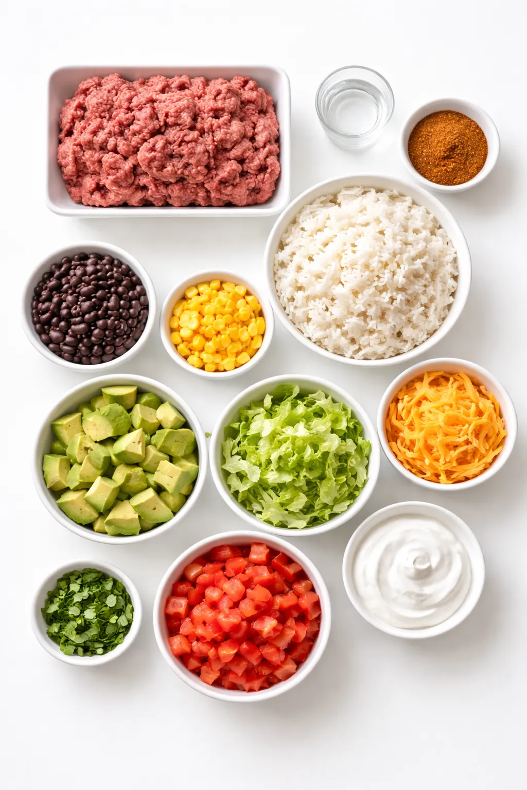 To each bowl, add 1 cup cooked rice as the base. Top with seasoned ground beef, black beans, corn, shredded cheddar, diced avocado, shredded lettuce, and chopped tomatoes.
