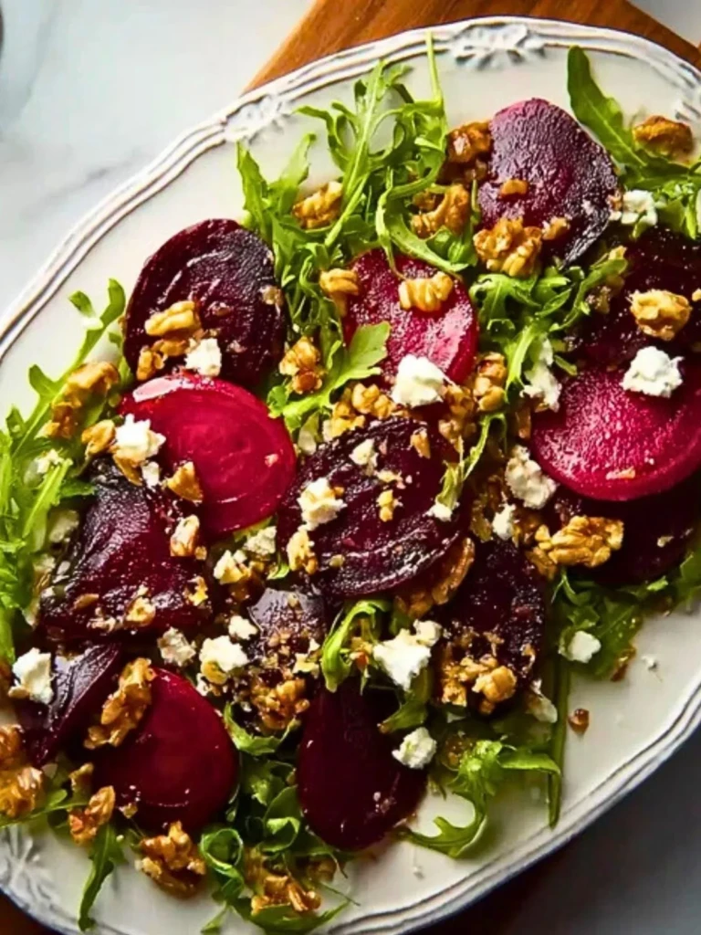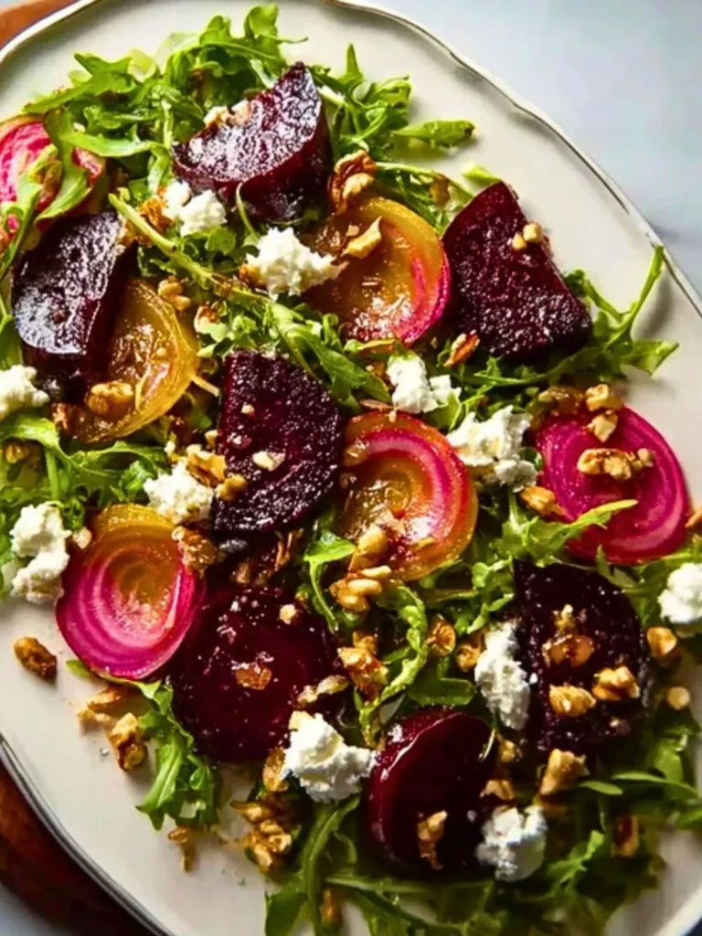 Roasted Beet and Arugula Salad A vibrant, earthy salad with roasted beets, peppery arugula, creamy goat cheese, and toasted walnuts, brought together with a drizzle of balsamic vinaigrette.