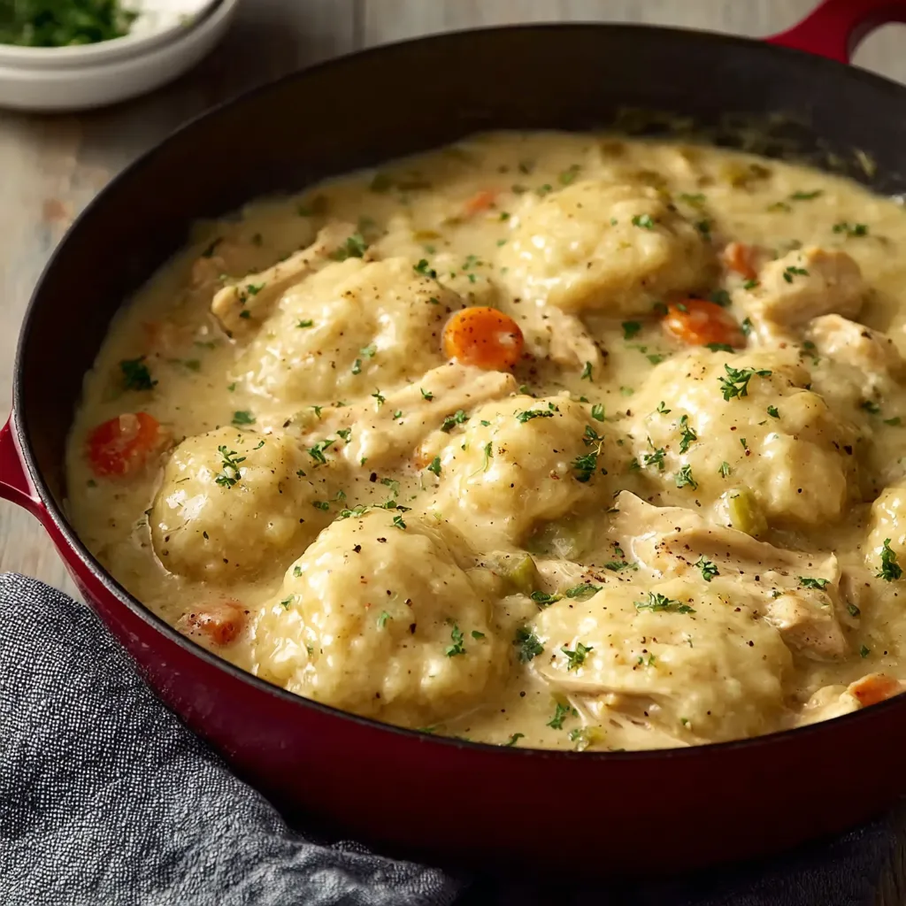 This dish wraps everything you love about chicken soup and buttery biscuits into one pot. The broth is velvety and full of flavor, the dumplings are tender without being gummy, and every bite has a little bit of everything—chicken, vegetables, and sauce.